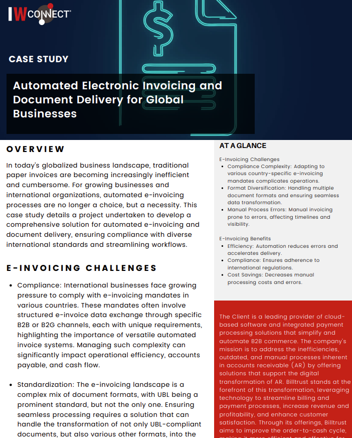 In today’s globalized business landscape, traditional paper invoices are becoming increasingly inefficient and cumbersome. For growing businesses and international organizations, automated e-invoicing processes are no longer a choice, but a necessity. This case study details a project undertaken to develop a comprehensive solution for automated e-invoicing and document delivery, ensuring compliance with diverse international standards and streamlining workflows.