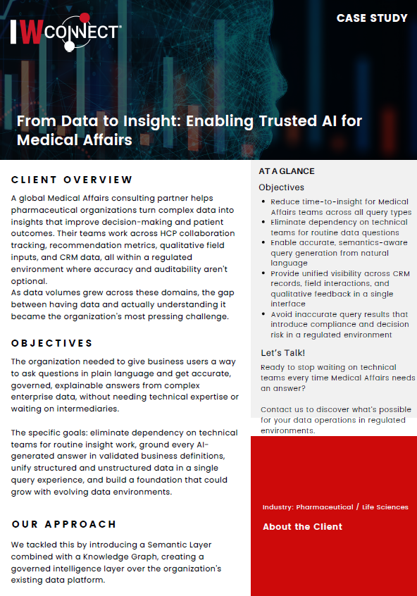 A global Medical Affairs consulting partner needed answers from complex, multi-source datasets spanning CRM records, field interactions, and qualitative feedback. But even simple questions required deep knowledge of schemas, data relationships, and metric definitions, creating bottlenecks and heavy dependency on technical teams.