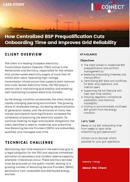 A leading European Transmission System Operator (TSO) is legally responsible for keeping the electricity grid balanced at all times. As the energy transition accelerated, the number of Balancing Service Providers (BSPs) grew rapidly, many using renewable and distributed assets. This growth increased operational complexity and exposed limitations in existing, manual prequalification processes.