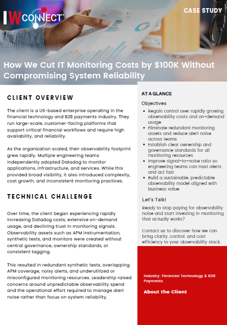 A US-based fintech enterprise running critical B2B payment platforms faced rapidly escalating Datadog costs and declining monitoring effectiveness. Multiple engineering teams had independently adopted observability tools without central governance, creating redundant synthetic tests, overlapping APM coverage, and noisy alerts. The result: unpredictable spending, extensive on-demand usage, and teams spending more time managing alert noise than improving reliability. Leadership needed to regain control over observability spend while maintaining system reliability for customer-facing financial workflows.