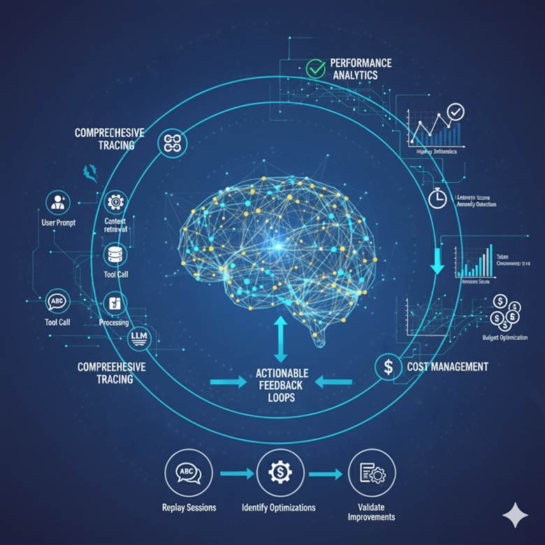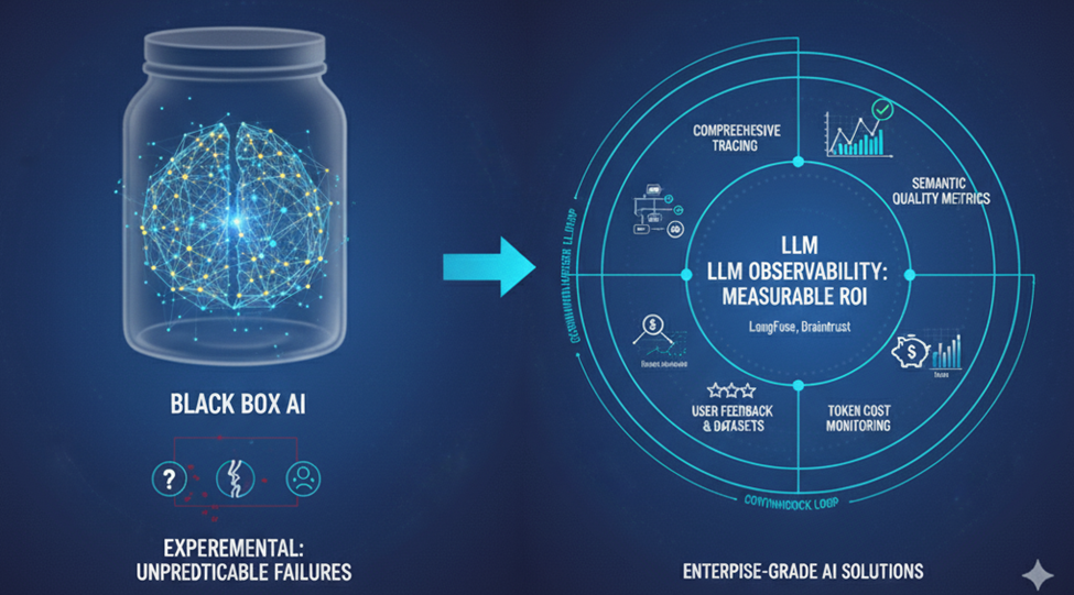 Bottom line: Enterprise-grade AI solutions require integrated observability platforms (like LangFuse or Braintrust) that create continuous feedback loops, enabling teams to demonstrate sustained ROI through measurable performance metrics and iterative refinement.